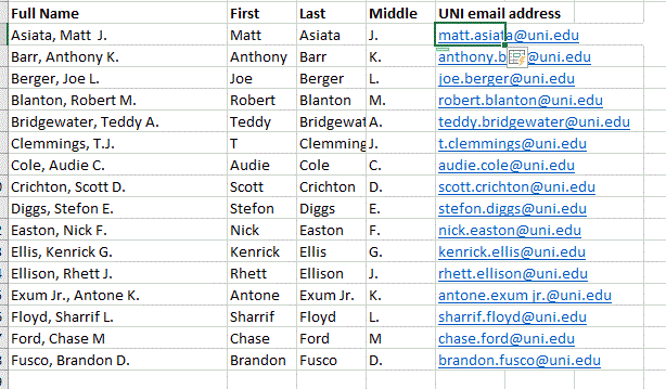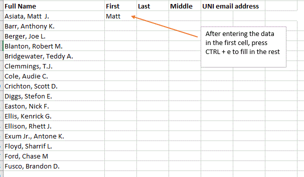 In the following examples, names of individuals were imported into a single column. The Flash Fill can be used to separate the names into 3 columns, but generate an email address, based on the pattern in the first cell of the column.